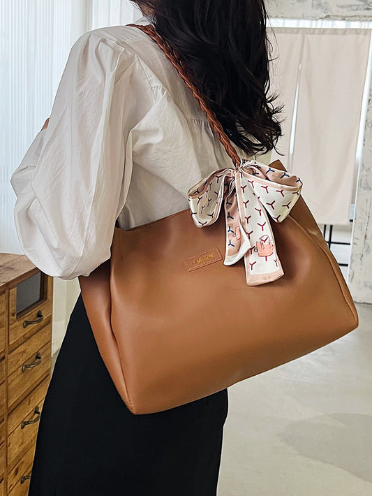 Women's Fashionable Letter Label Decorated Tote Bag,Retro Casual Large Capacity Shoulder Bag with Silk Scarf Decor